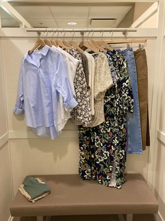 On the day of the appointment, I get to the first shop early to set up a dressing room with the rack of clothes, then I meet the client and we have a quick chat about what the plan is, reminding them of the details I've already shared by email.