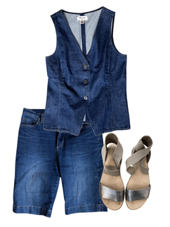 A variation on the Texas Tuxedo! The two denims play nicely together, and I love how the cross on the sandal straps is mimicked in the vest.